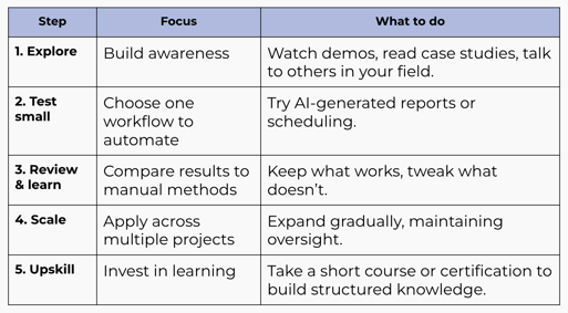 This might sound like an over-simplification, but what I mean is that you should learn AI in a vocational way, putting your efforts into learning the skills, practices, and softwares that project managers actually need in their sector. While many courses might promise to broadly "teach you AI", what you need is to sharpen specific skills that will give you the edge in the project sector.