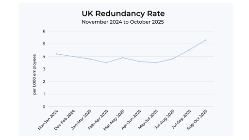 According to the Office for National Statistics (ONS), the UK redundancy rate for August-October 2025 stood at 5.3 per 1,000 employees, with an estimated 156,000 workers made redundant in that quarter.