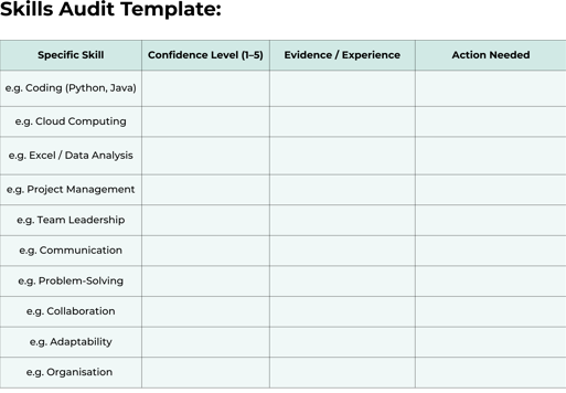 A skills audit is simply a structured way of reviewing your abilities, knowledge, and experience to see how they match up against your career goals. Think of it as taking stock of everything you bring to the table — from technical expertise to transferable soft skills like problem-solving or communication.